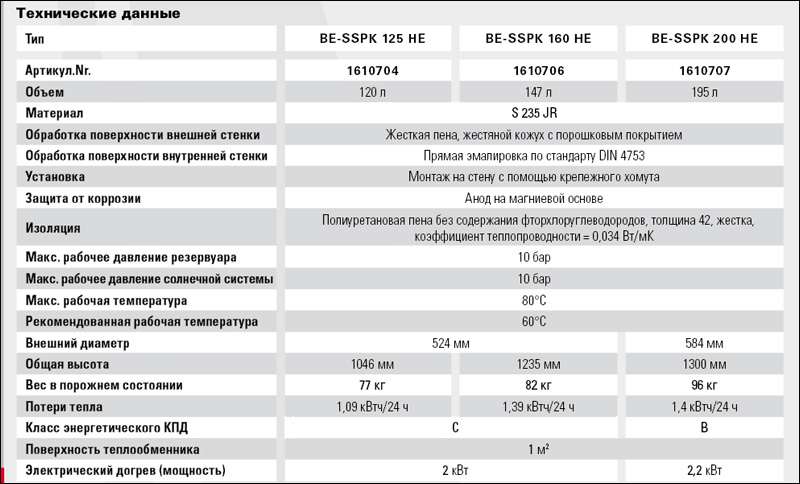 Накопитель горячей воды BE-SSPK из стали S 235 JR с солнечным теплообменником и непосредственной эмалировкой согласно стандарту DIN 4753, включает в себя анод на магниевой основе и систему электрического догрева.