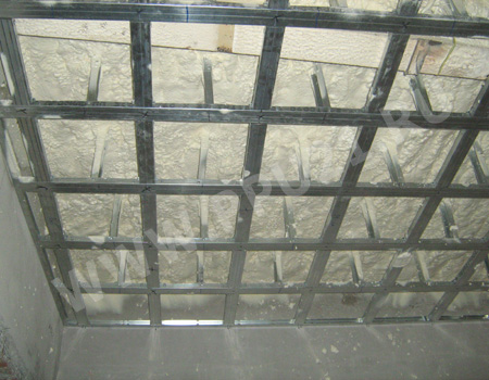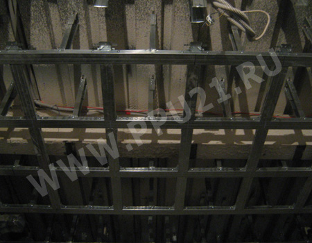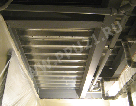 Вид части потолка с направляющими для напыления теплоизоляционного материала.