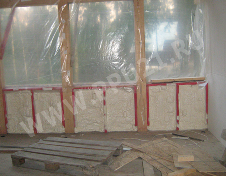 Процесс заполнения теплоизоляционной пеной промежутков между лагами. Теплоизоляция стены