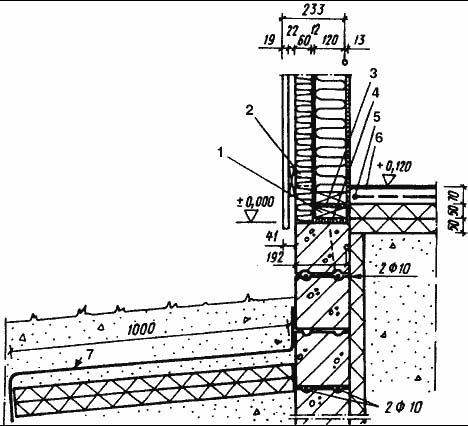 1 - несущий каркаса из антисептированных деревянных брусьев сечением 45х120 мм, обеспечивающий крепление каркаса панелей наружных стен к фундаменту; 2 - прокладки; 3 - монтажный шов; 4 - уплотнительная прокладка; 5 - армирующая сетка из стали диаметром 4 мм с ячейками размером 150х150 мм; 6 - уровень чистого пола (верх покрытия пола); 7 - полиэтиленовая пленка (гидроизоляционный слой).