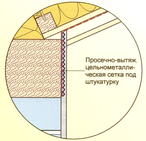 Воздухонепроницаемый стык легкой деревянной конструкции кровли с несущей отштукатуренной стеной. Узел легко решен в новом исполнении: пленка сначала укладывается с выступом 8…20 см на несущую стену. Поверх пленки к стене крепится просечно-вытяжная цельнометаллическая сетка под штукатурку.