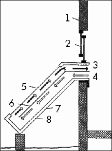 Как видно из рис. 7, солнечный коллектор южной ориентации наклонно опирается на стену здания. Высокий бак с горячей водой без теплоизоляции находится в помещении, примыкая хорошо изолированной стенкой к наружной стене.