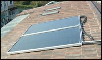 Один из самых простых способов использования солнечного тепла при существующих крышах заключается в пропускании воды поверх гонтовой поверхности. Теплоприемная поверхность должна быть как можно более черной, при необходимости окрашенной и свободной от мусора. К стропилам крепятся рамы для двух слоем остекления и конструкционного материала (например, полиэфирной смолы, армированной стекловолокном) с учетом мер для предупреждения протечек.